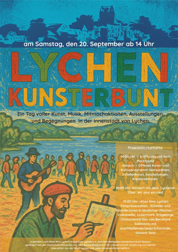 Lychen Kunsterbunt ist organisiert vom Alten Kino Lychen, Kulturbüro Lychen e.V. und dem Mehrgenerationenhaus Erich Rückert, gefördert von der Hochschule Mittweida und dem Bundesministerium für Landwirtschaft, Ernährung und Heimat, unterstützt von der Stadt Lychen und vielen ehrenamtlichen Helfern
